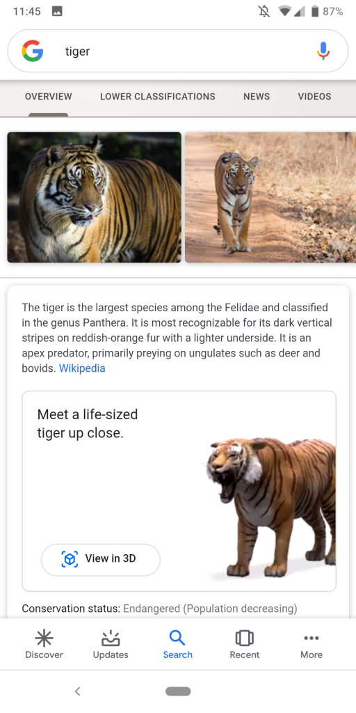 Another is, open the Chrome browser on your smartphone and search for one of a dozen or so animals including Wolf, Penguin and more, in the search results, the animal will then present with a “view in 3d” option, when clicked, if your phone has AR support (such as the Samsung Galaxy phones, Google Pixel phones, and more) you will then get an option to view it in real life.